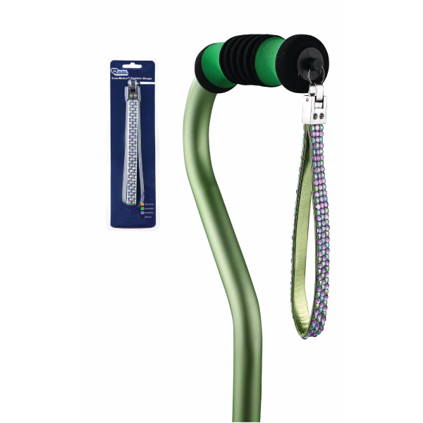 A stylish way to keep your cane at hand. Made with soft, flexible leather and embellished with twilight crystals for some added bling!