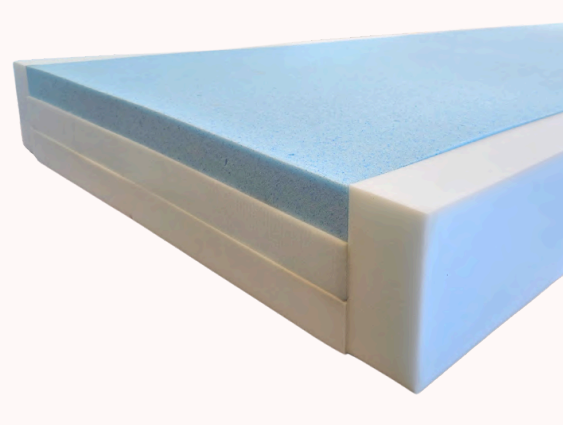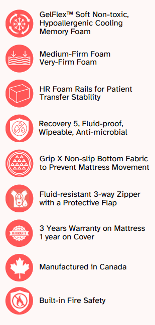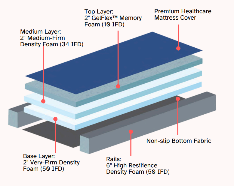 A triple-layer design with gel-infused memory foam for pressure redistribution, mediumdensity foam, high-density base layer for balanced support, and firm transfer rails aids in stability during transfers and bedside ADLs