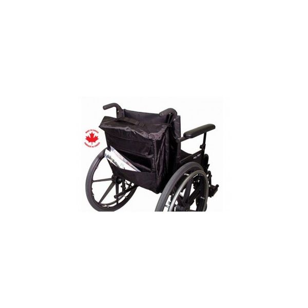 Size 14" wide x 15" deep (36 x 38m) with two outside pockets. Nylon straps for hanging over wheelchair handles. All flaps close with Velcror, easily opened especially if there is a dexterity problem.