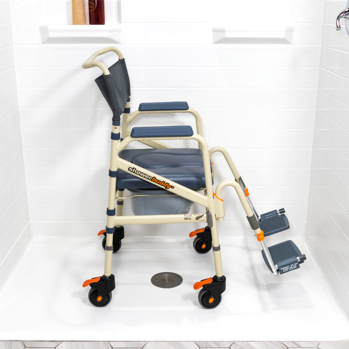 Is designed for use in a curbless/accessible or roll-in shower stalls. The SB7E can roll over most toilets to be used as an over-toilet commode and can also double as a bedside commode. It is lightweight yet sturdy, built with a strong aluminum frame, which is great for home use but also ideal for travel.