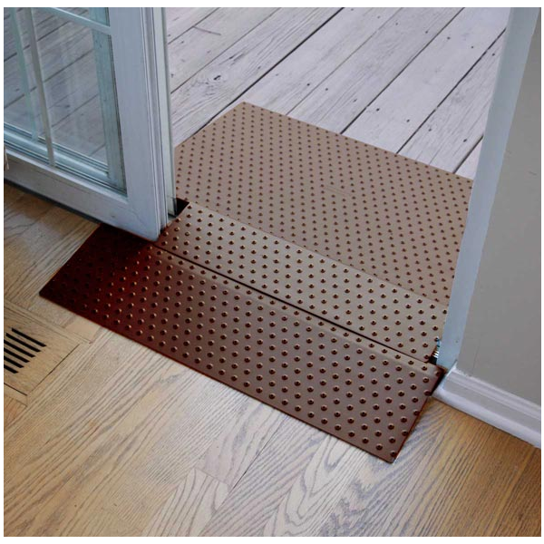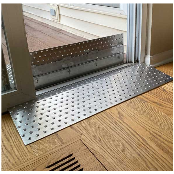 The Sliding Door Threshold Ramp has a 750 lb capacity and creates a smooth, continuous platform over the tracks. The surface of the aluminum ramp features HandiRamp’s patented non-slip raised buttons that ensure superior traction and safety, which is especially important when the outdoor section may be wet from a rainstorm.